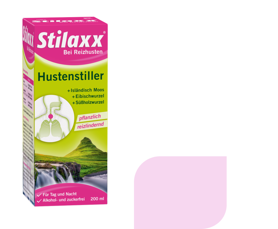 Die Stilaxx® Formel ist eine einzigartige pflanzliche 3-fach Kombination aus den Pflanzenextrakten von Isländisch Moos, Eibischwurzel und Süßholzwurzel. Diese erzeugen einen balsamartigen Schutzfilm, der sich an die Schleimhaut haftet und somit Hustenreiz lindert.
